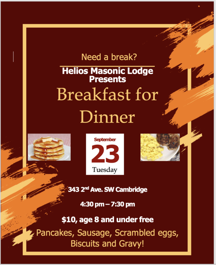 September 23rd Tuesday Breakfast for Dinner. Meal starts at 4:30 p.m. runs until 8:30 p.m.