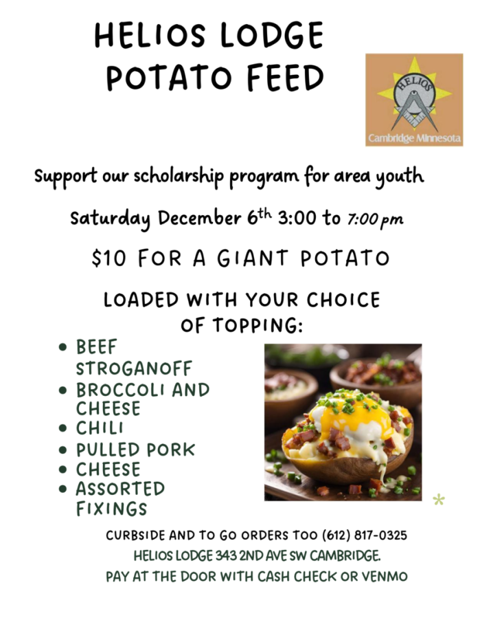 December 6th Saturday Potato Feed Dinner for he school scholarship. Arrive by 2:00 p.m. Dinner runs from 3:00 to 7:00 p.m.